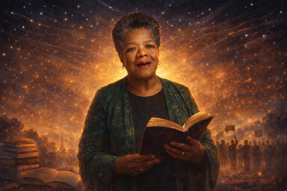 Acknowledgement: Featured image of Maya Angelou was updated in February 2026. The artwork was conceived by Meserette using AI image‑generation tools as part of the creative process. Visual concepts and prompts were developed in collaboration with Perplexity (GPT‑5.1) and ChatGPT. The artwork features a luminous portrait of Maya Angelou. She stands calm and radiant, mid‑recitation, with books, musical notes, and civil rights marchers subtly woven into the background to represent her many lives as author, historian, performer, and activist, conveying the feeling of ‘one of the brightest lights of our time’ shining hope into a troubled world.