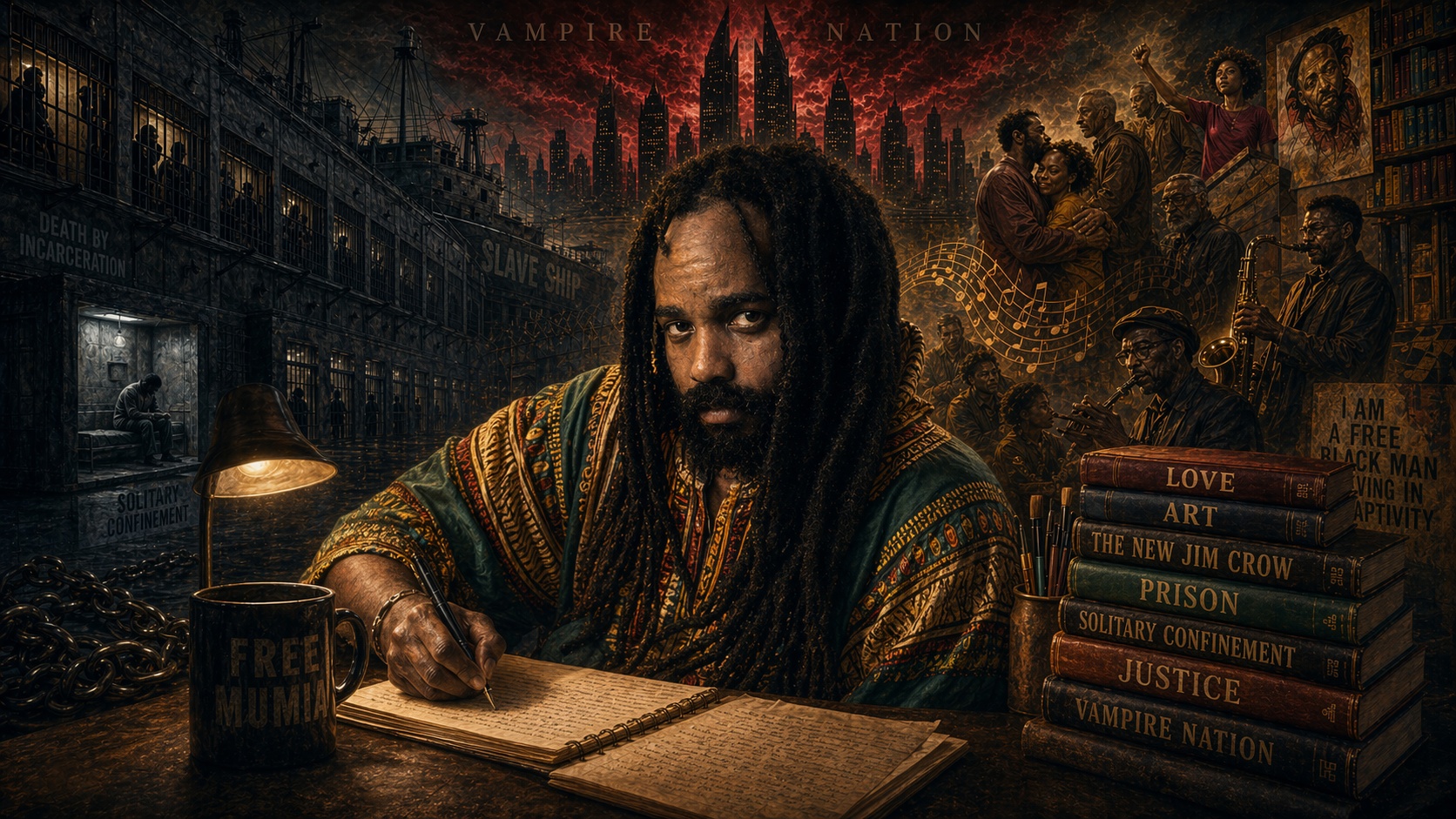 The following reflections summarise key themes in Abu-Jamal’s thought—on love, art, the New Jim Crow, prison, solitary confinement, justice, and the “Vampire Nation”—drawing directly from his own words and writings.