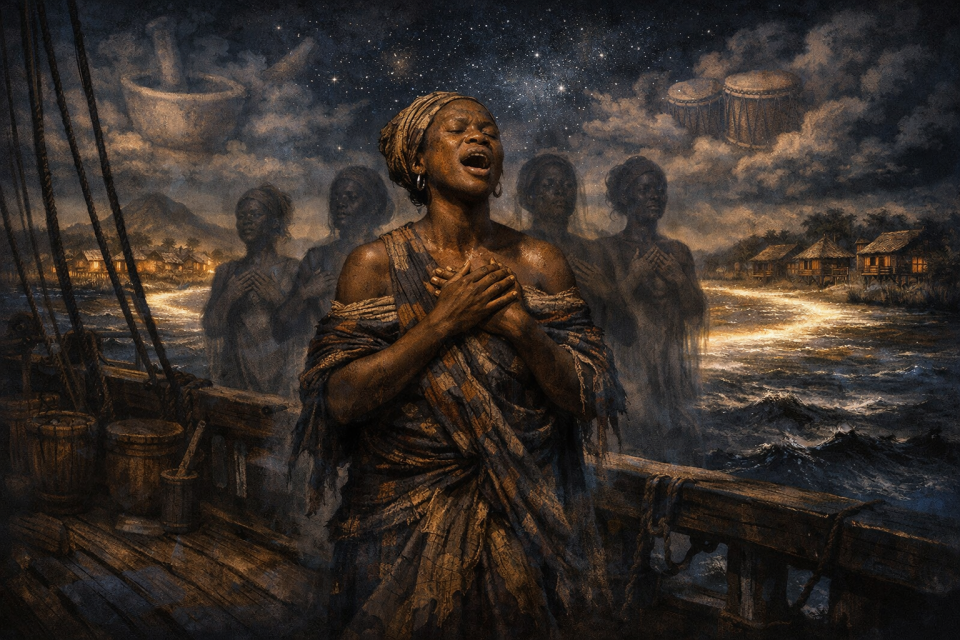 In a Gullah home along the coastal marsh, a woman sits by lamplight, hands crossed over her chest as she sings the fragment of a children’s rhyme learned from her mother and grandmother. Outside the window, spectral foremothers—Mende women from long ago—stand above the wetlands, accompanied by the faint outlines of drums and a mortar and pestle, showing how a funeral dirge in an unknown language survived in the “language you cry in.”
