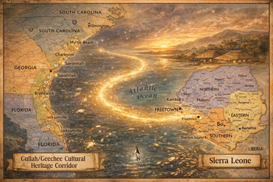 The Gullah/Geechee Cultural Heritage Corridor and Sierra Leone face each other across a glowing “river” of light, transforming the routes of the Atlantic into a path of return. The map visually traces the journey of Amelia’s Mende funeral song—from Senehun Ngola in southern Sierra Leone to the sea islands and marshlands of Georgia and South Carolina—reimagining the Middle Passage as a conduit of ancestral remembrance rather than a void.