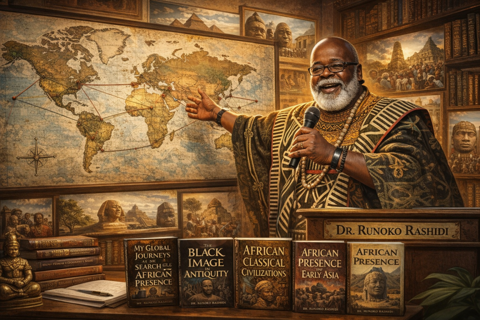 Acknowledgement: I gratefully acknowledge the support of Perplexity (Tylis), powered by GPT‑5.1, in drafting the biographical summary of Dr. Runoko Rashidi and in formulating the illustration prompt that visually reflects his life’s work as a historian and global traveler. The featured image of Dr. Runoko Rashidi was generated with the assistance of artificial intelligence and creative direction provided through ChatGPT (“Spruce”). The image was conceived as a respectful visual tribute to Dr. Rashidi’s life’s work as a Pan-African historian, lecturer, and global researcher. It seeks to represent his enduring commitment to documenting the Global African Presence, his extensive world travels, and his mission to uplift African people through scholarship, public teaching, and historical recovery. Every effort was made to render him with dignity, warmth, and intellectual authority, reflecting both the seriousness of his research and the humanity for which he was widely known.