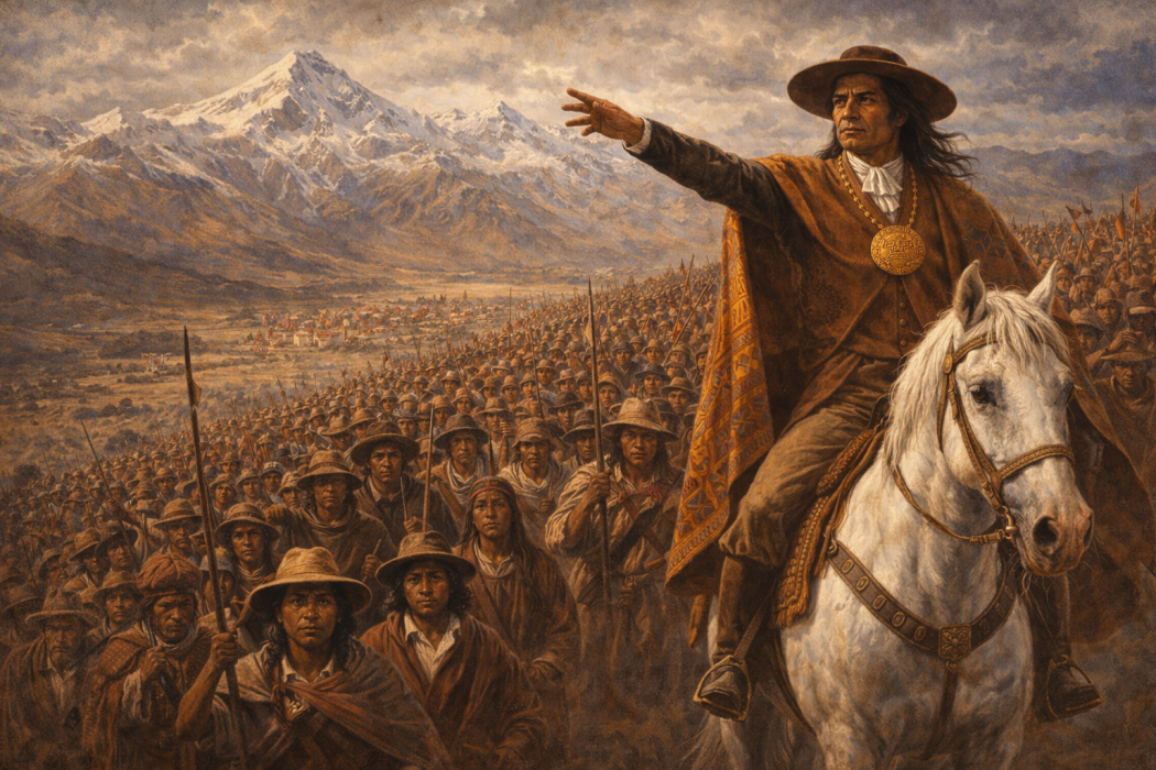 In the Tinta province, already scarred and thinned out by the drain of forced labour to the silver mountain of Potosí, Túpac Amaru II rode into the plaza of Tungasuca and announced an end to both the corregidor and the mita. Mounted on a white horse, accompanied by drums and the sound of pututus, he declared that the age of forced labour, taxes, and captivity was over. He proclaimed freedom for those in bondage, abolished tribute and forced lavour and named himself father to the poor and helpless. Thousands rallied to his side. As he advanced toward Cuzco at the head of his guerrilla columns, he promised that those who fell in this war would rise again to share in the wealth and joy stolen by the invaders. The Revolution moved in waves of victory and defeat, but from that moment, the Andean world knew that something irreparable had broken in the oppressive order.
