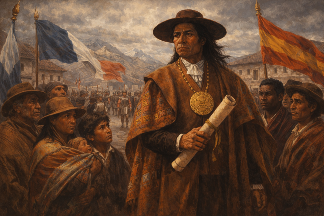 José Gabriel Condorcanqui Noguera was born in the 1740s in the Tinta region, near Cuzco, in the Viceroyalty of Peru. He was an Indigenous noble who claimed descent from the last Inca ruler executed by the Spanish, Túpac Amaru I. Condorcanqui was also of mixed heritage – Indigenous Peruvian and European (Spanish) descent. He received a Spanish Jesuit education at the San Francisco de Borja School, founded specifically for the sons of Indigenous leaders, and was literate in Spanish and Latin in addition to his native Quechua. This literacy and schooling gave him the tools to draft petitions, letters, and proclamations that the usurpers could not simply dismiss as ignorance. Condorcanqui was a prosperous merchant and muleteer, owning approximately 350 mules used to transport minerals and goods throughout Upper Peru. This business gave him extensive regional contacts and a deep understanding of the economic hardships faced by various indigenous communities. In 1760, he married Micaela Bastidas, who became his most trusted advisor and a key military commander in his later uprising. They had three sons: Hipólito, Mariano, and Fernando.